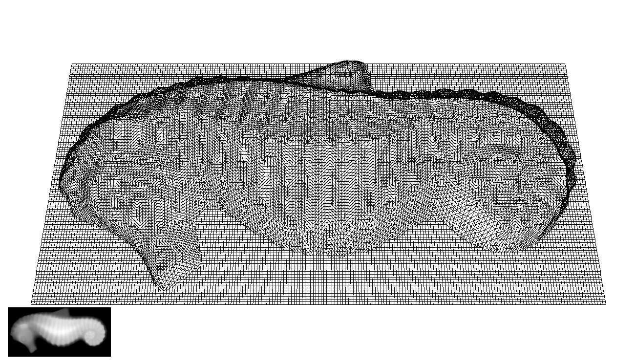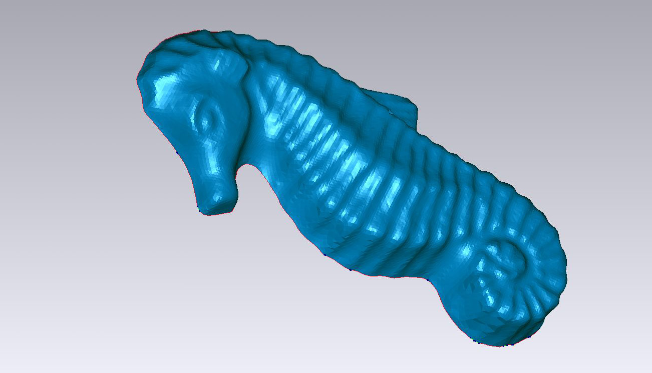 | Nube de puntos del caballito de mar | Nube de puntos + 3D Facets del caballito de mar | Malla de superficies del caballito de mar |